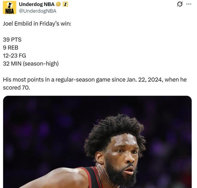 值得一提的是,恩比德上一次单节拿到30+得分表现还要追溯到24年1月份,在那场比赛中恩比德狂轰生涯新高的70分。