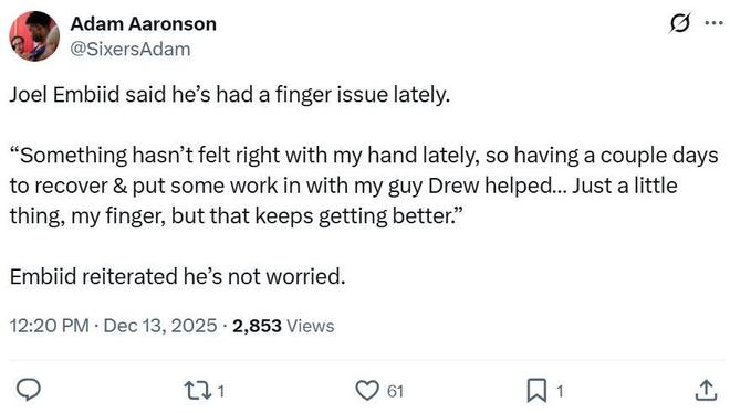 而伤病显然是导致这一切的根源,也是恩比德难以摆脱的魔咒,本场轰下39分后,恩比德赛后透露自己又遭遇了手指伤病,本场其实是带伤作战。