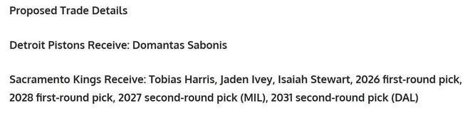 国王得到:哈里斯+艾维+斯图尔特+26年首轮+28年首轮+27年二轮+31年二轮。