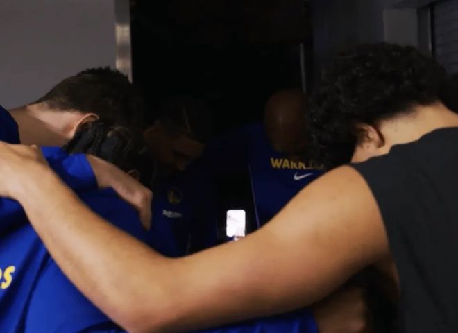 库里生病未随队出征客场,但赛前勇士球员围圈鼓劲时,库里通过视频方式参与。